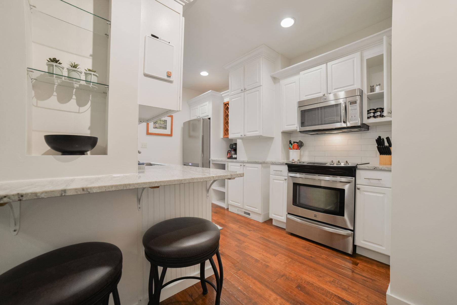 Just off the kitchen, you’ll find a private back deck with seating for two, perfect for relaxing outdoors. A convenient pathway leads directly from the deck to the fenced parking lot, making coming and going simple and secure.